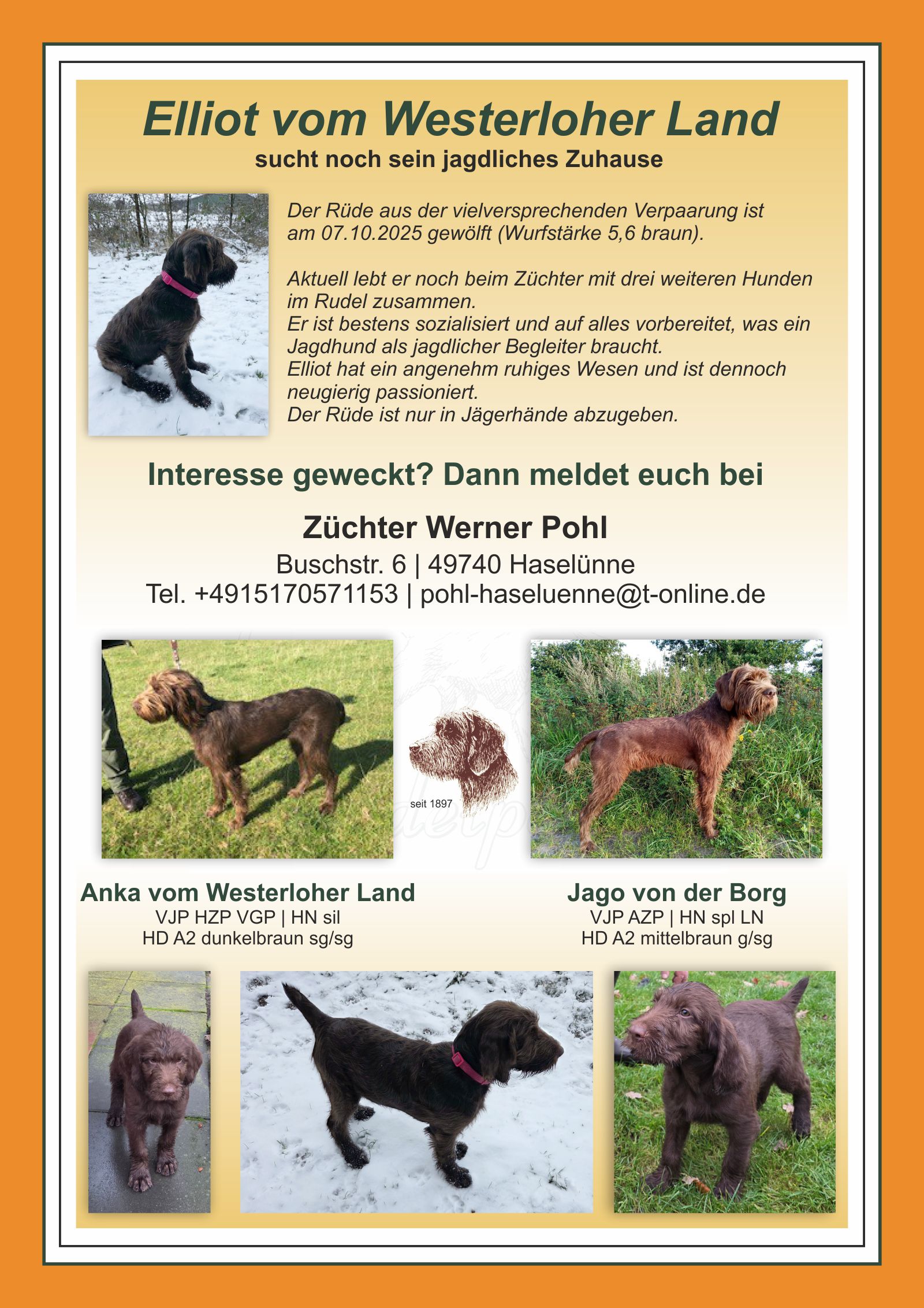 dunkelbraungew. Dez 2022mit allen Prüfungenmit 1 Jahr JagderfahrungFamilienfreundlichmit Haus und Hof vertraut abzugeben unterTel. *protected email* oder *protected email*